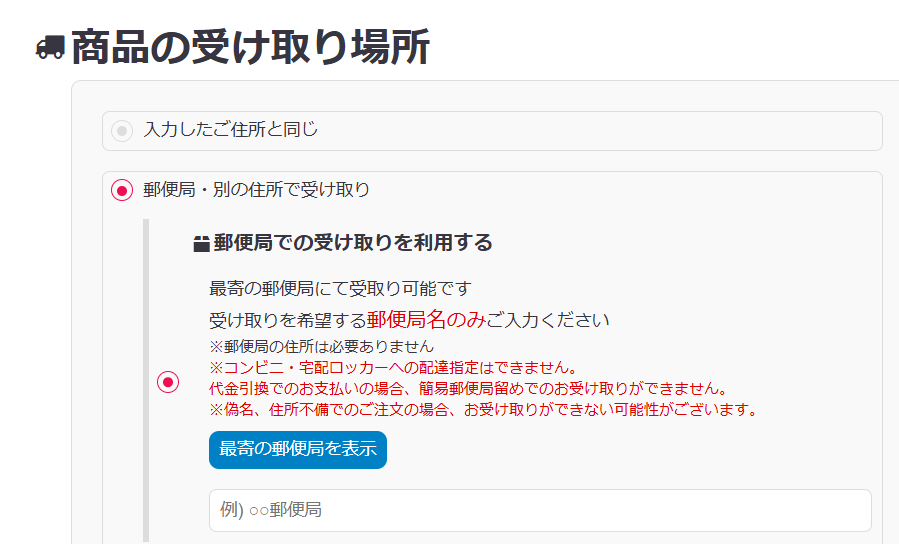 - 「郵便局受け取り」を選択して注文
